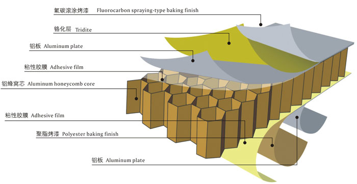鋁蜂窩板正面鋁板表面涂覆符合AAMA合ECCA質(zhì)量標(biāo)準(zhǔn)的氟碳烤漆,顏色選擇與金貫鋁塑復(fù)合板一樣,提供大范圍的標(biāo)準(zhǔn)色,包括合金屬色,也可由客戶指定顏色。建筑戶外用蜂窩板表面采用氟碳(PVDF)輥涂、烤漆或陶瓷涂料,具有優(yōu)異的耐氣侯、耐紫外線、耐潮濕、耐污染等。