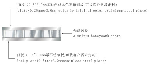 不銹鋼蜂窩板面板為彩色不銹鋼,背板為本色不銹鋼,芯層為鋁蜂窩芯。
