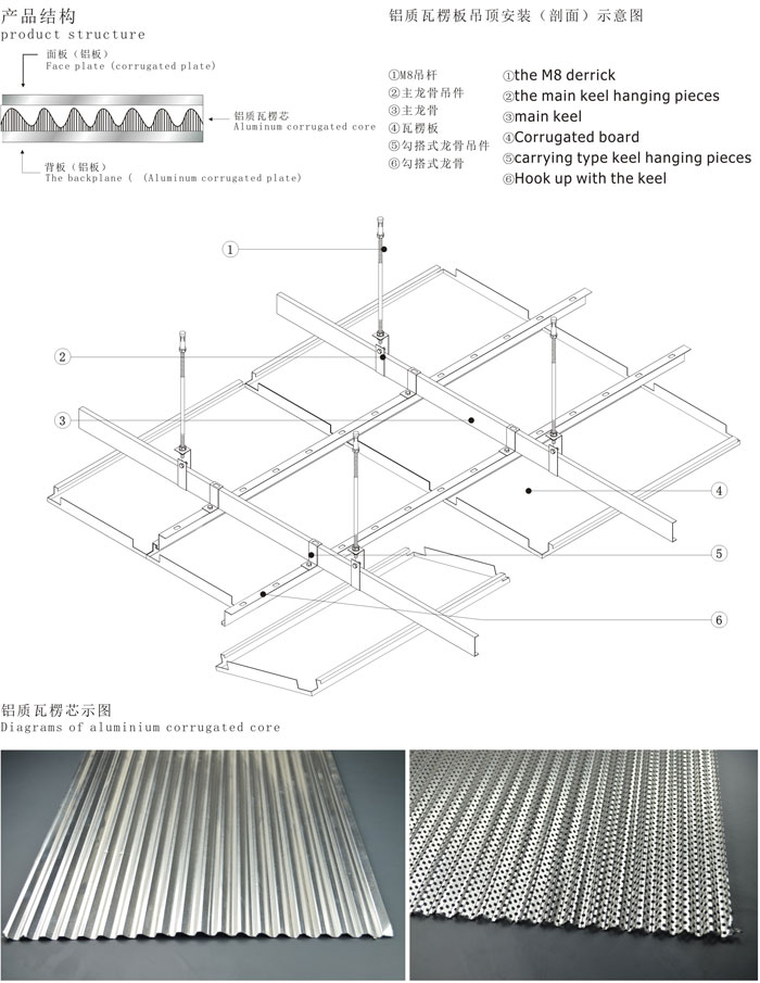 瓦楞板構造主要由鋁質面板,瓦楞芯構成。極大增強了鋁質瓦楞板幕墻的強度與鋼性。保證了長期使用中的平整度及抗風抗震能力,有極強的隔熱、隔音、防火、保溫作用,是新型“節能”、“環保”裝飾材料。
