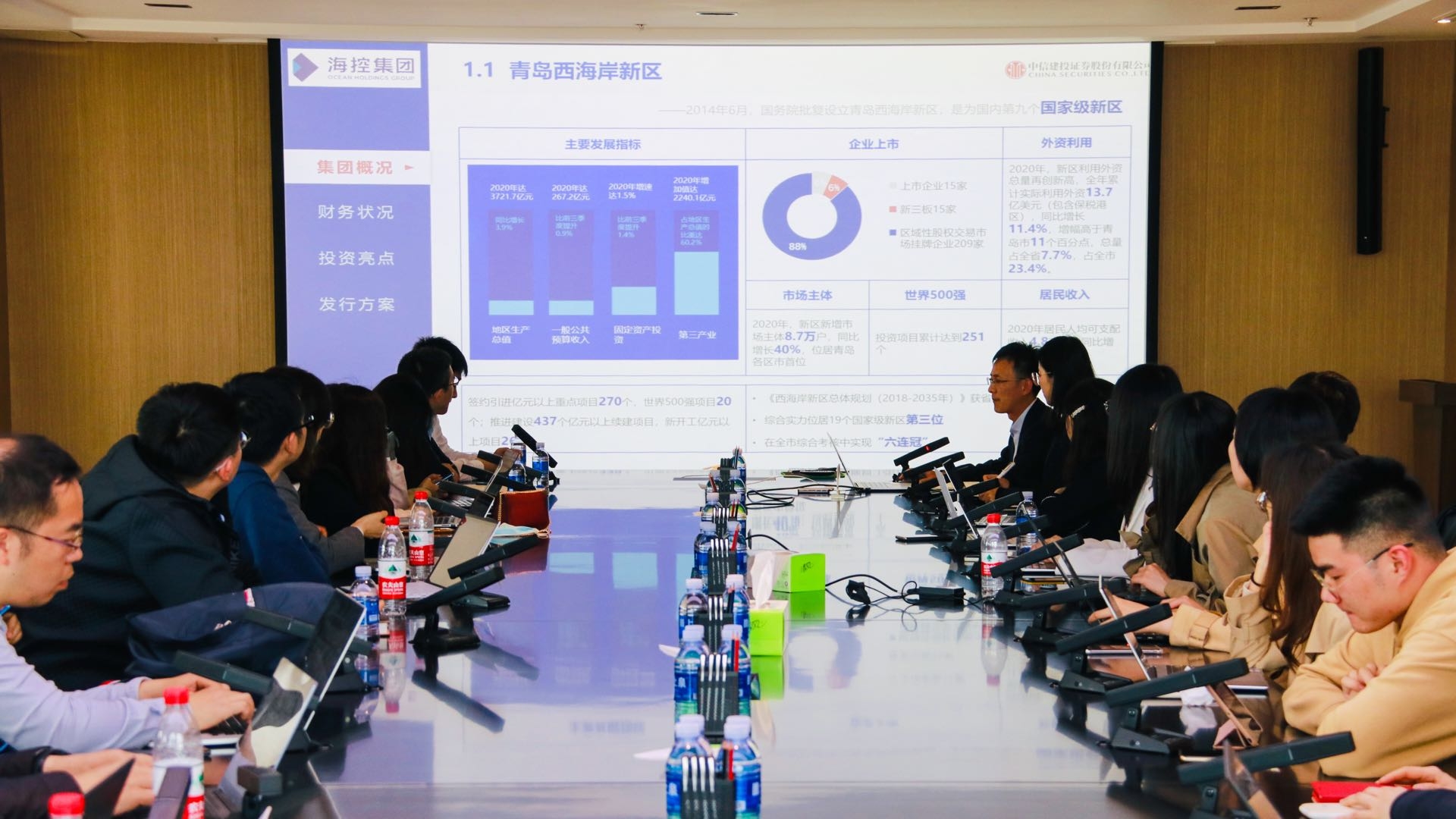 海控集團融資負責人對青島西海岸新區和海控集團發展情況進行了全面介紹。海控集團作為新區國有資本控股集團,截至2020年12月,注冊資本50億元,控股一級公司16家,其中上市公司1家,持股公司9家,直屬子公司6家,資產總額約1100億元,獲AAA主體信用評級。