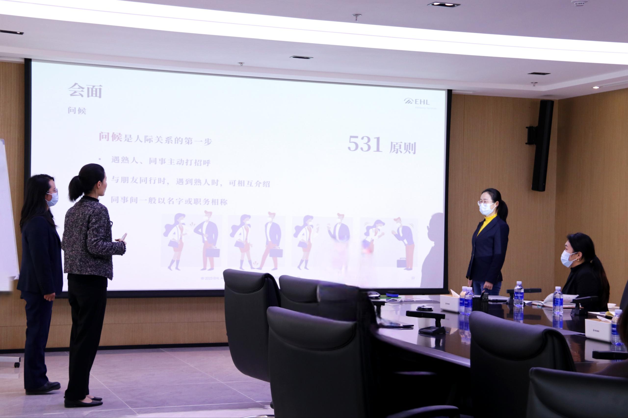 此次培訓(xùn)邀請了洛桑酒店管理學(xué)院集團(tuán)咨詢公司顧問呂堃講師、助理顧問謝一晗講師針對商務(wù)禮儀進(jìn)行授課。在培訓(xùn)中,兩位培訓(xùn)講師采取理論教學(xué)和現(xiàn)場互動(dòng)實(shí)踐相結(jié)合的方式。一方面,通過援引事例生動(dòng)闡釋商務(wù)禮儀的概念、作用、行為標(biāo)準(zhǔn)等理論知識;另一方面,通過場景模擬實(shí)踐、特定情境互動(dòng)表演等環(huán)節(jié)詳細(xì)示范和訓(xùn)練禮儀規(guī)范。參訓(xùn)人員即學(xué)即練,在現(xiàn)場實(shí)踐互動(dòng)中加深了對商務(wù)禮儀的理解和把握。